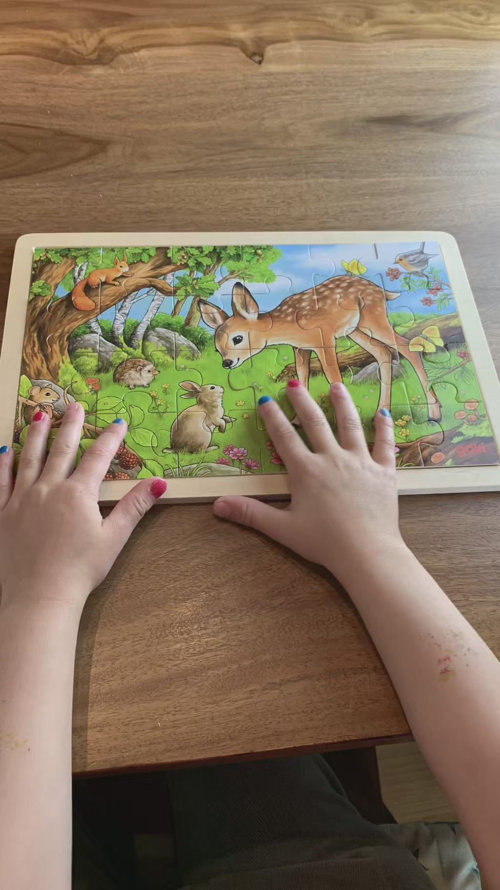 Ótrúlega fallegt og ævintýralegt púsl þar sem öll dýrin í skóginum eru vinir. Við sjáum dádýr og kanínu vera að kynnast hvort öðru, þefa og njóta veðurblíðunnar ásamt fleiri dýrum. Þetta dásamlega viðarpúsl frá Goki inniheldur 24 púsl.