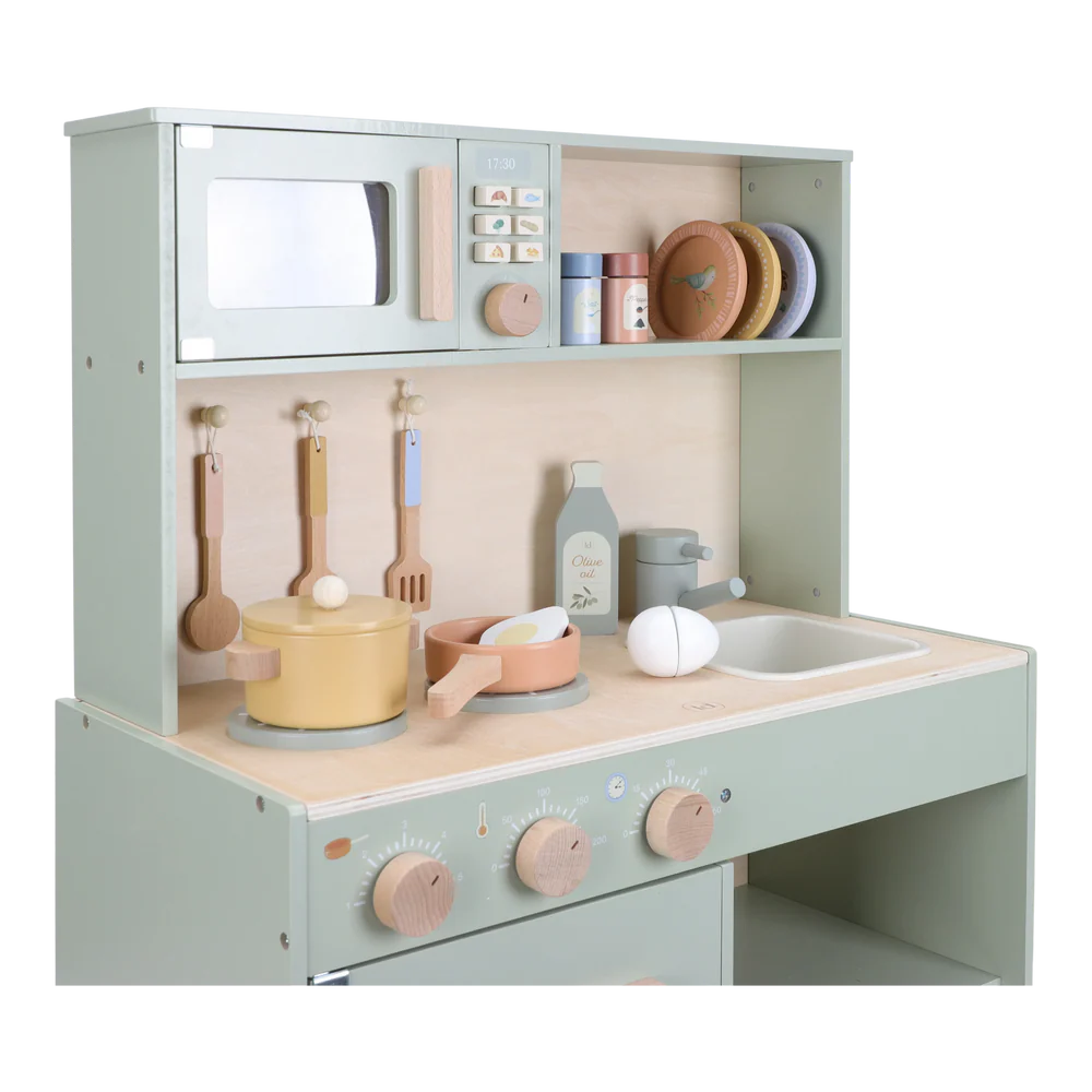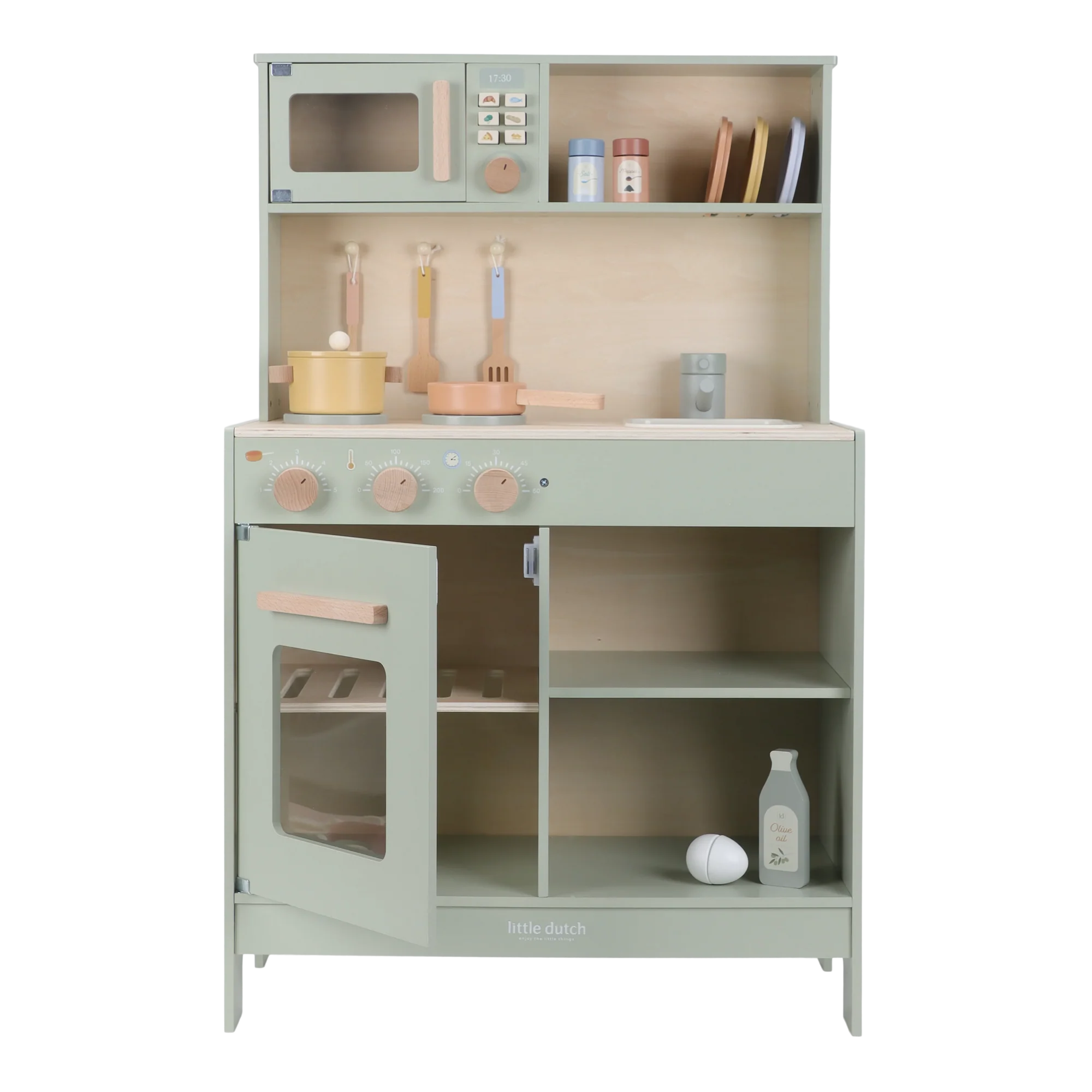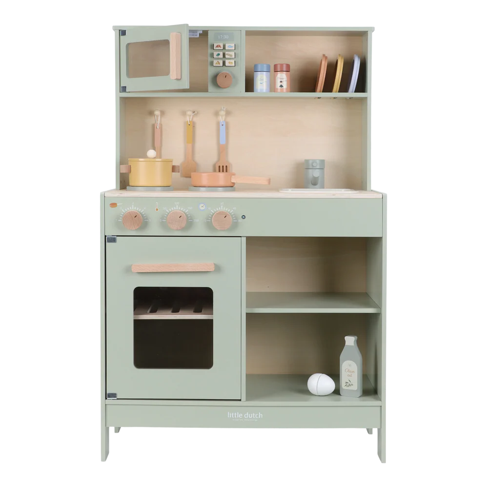 Núna getur barnið gleymt sér í hlutverkaleiknum í fallega viðar leikfangaeldhúsinu frá Little Dutch. Með eldhúsinu fylgir pottur, panna og öll helstu áhöld svo að barnið töfrað fram ljúffengar kræsingar fyrir fjölskyldu, vini, bangsa og dúkkur!