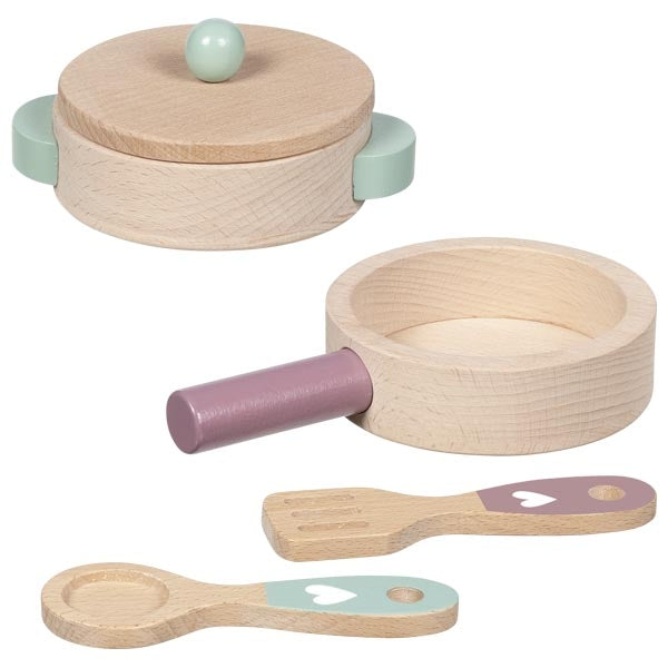 Pottur og panna úr við ásamt spaða og sleif frá Goki. Hentar fullkomnlega fyrir börn sem hafa gaman að því að matreiða og leika í þykjustuleik.