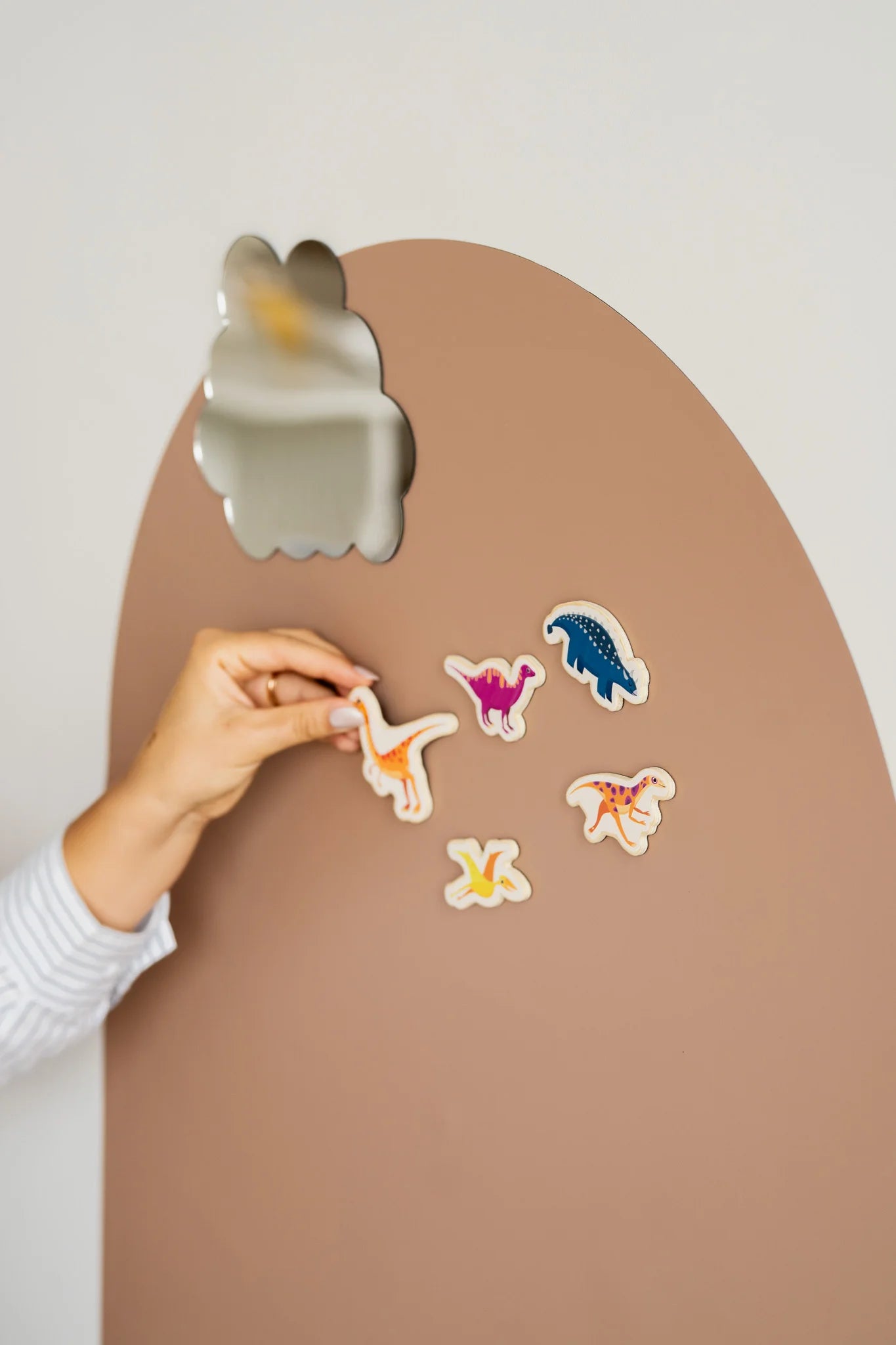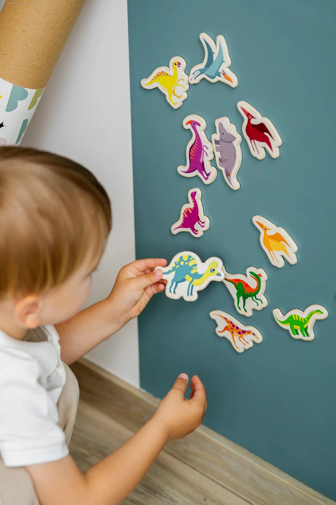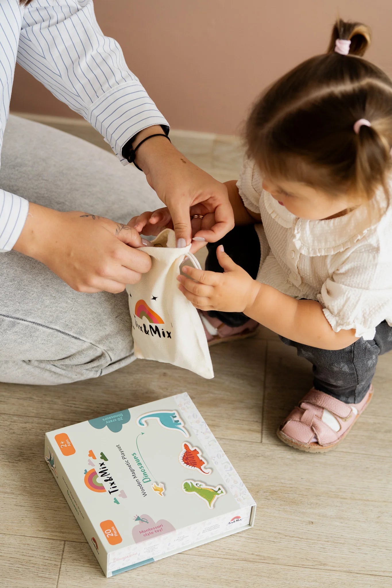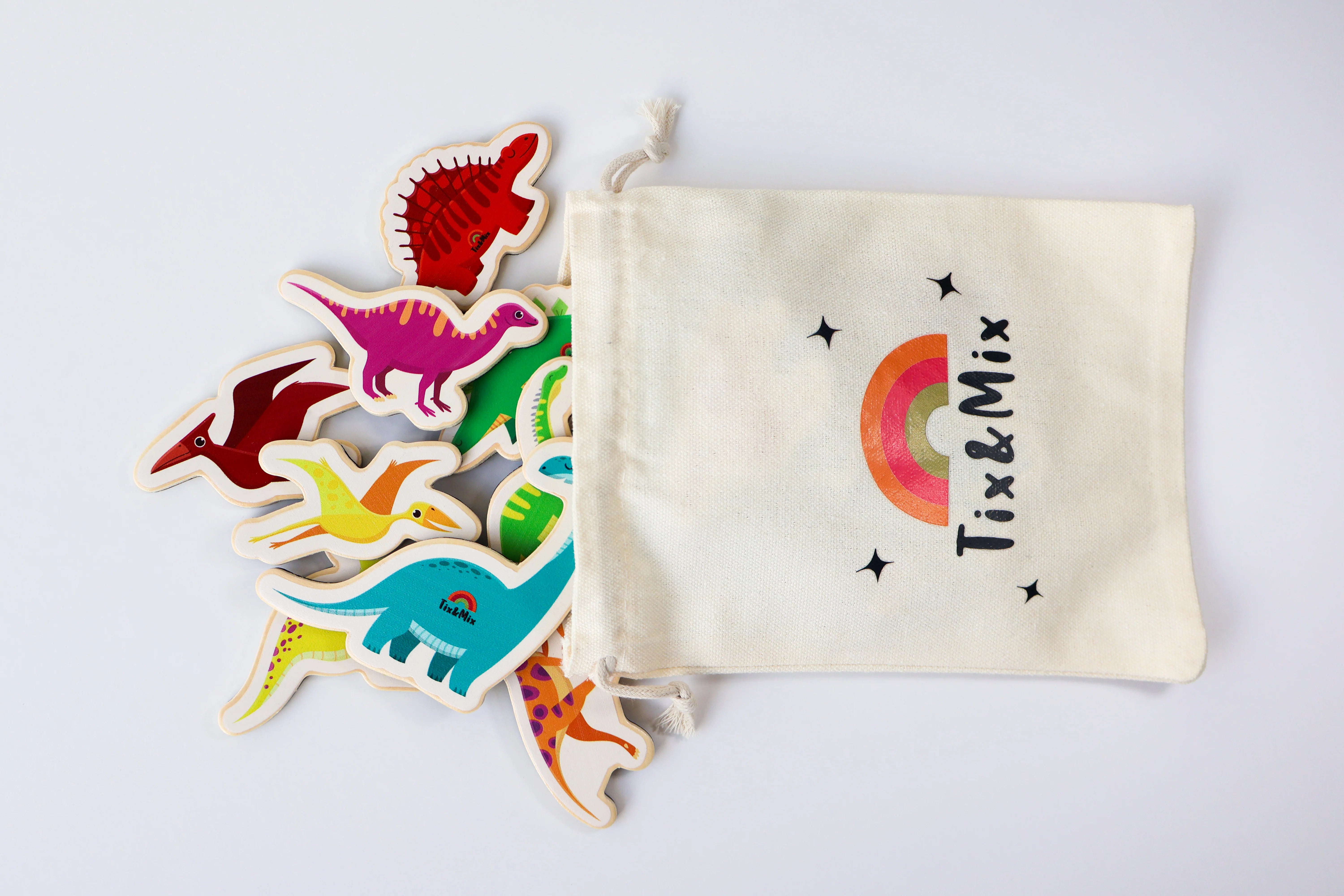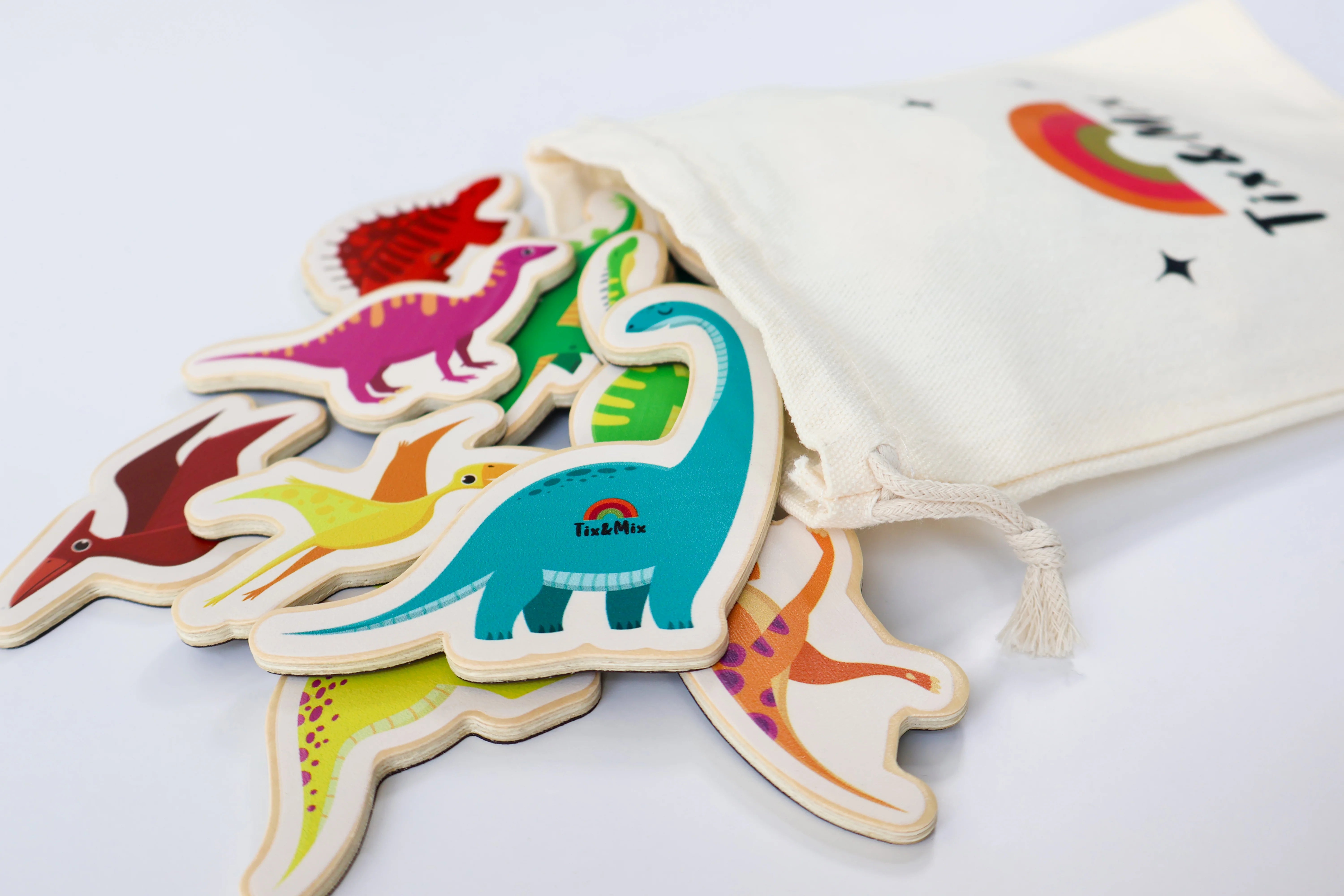 Pakkinn inniheldur 20 ólíka risaeðlusegla sem eru sérstaklega hannaðir fyrir segulvegginn frá TixMix. Seglarnir eru gerðir úr hágæða við og málaðir með eiturefnalausri og umhverfisvænni málningu. Með fylgir bómullarpoki sem hægt er að geyma seglana í.