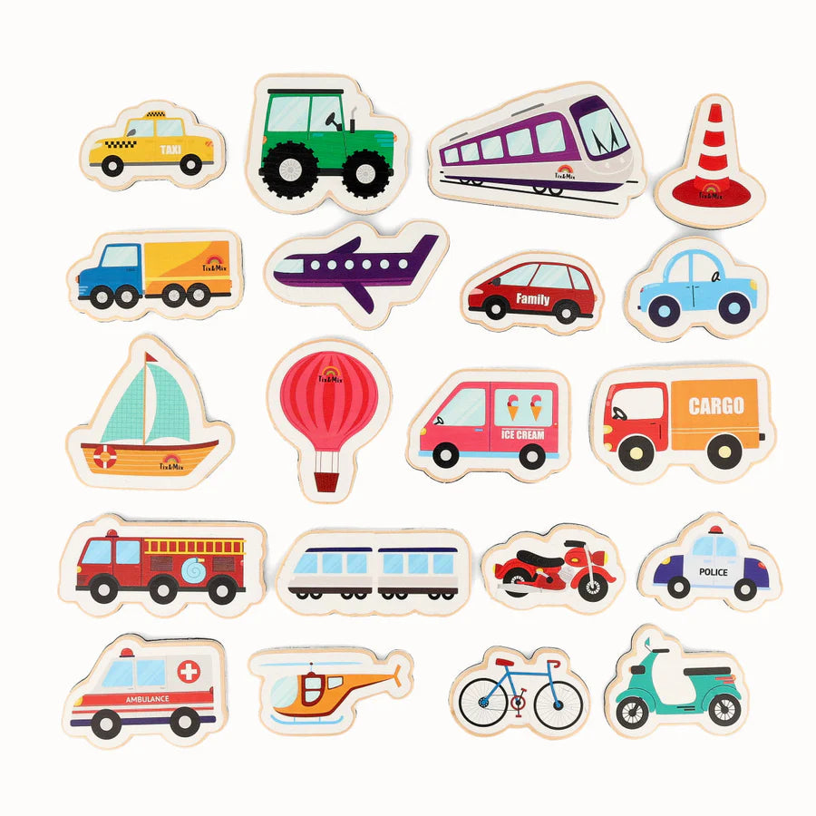 Pakkinn inniheldur 20 segla með ólíkum myndum af faratækjum sem eru sérstaklega hannaðir fyrir segulvegginn frá TixMix. Seglarnir eru gerðir úr hágæða við og málaðir með eiturefnalausri og umhverfisvænni málningu. Með fylgir bómullarpoki sem hægt er að geyma seglana í.