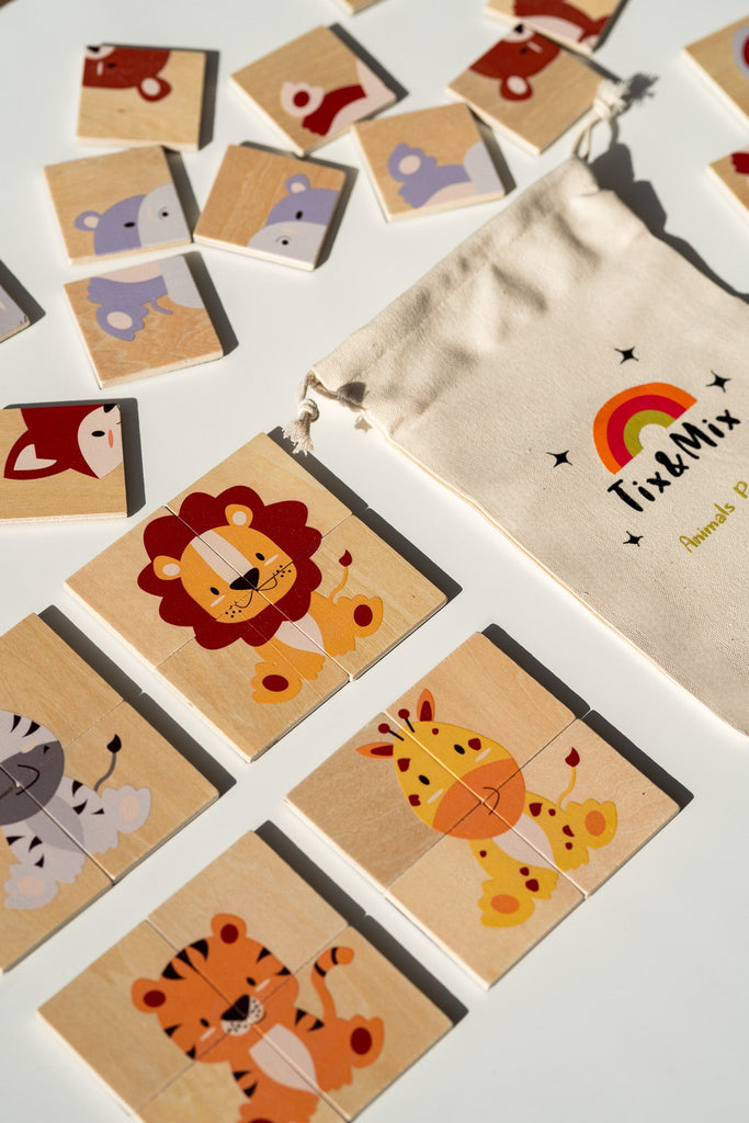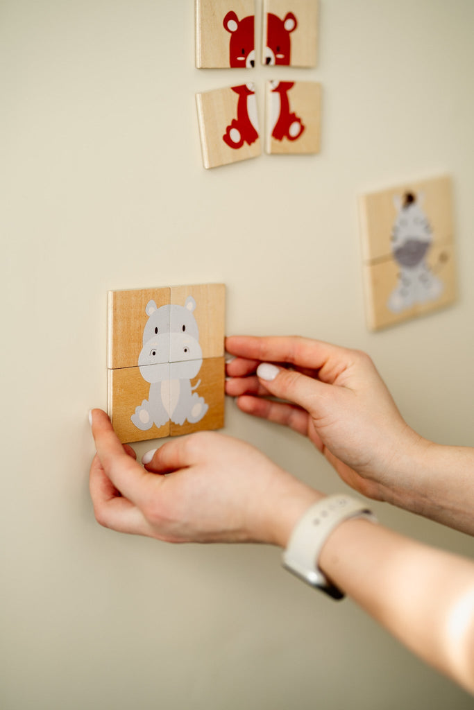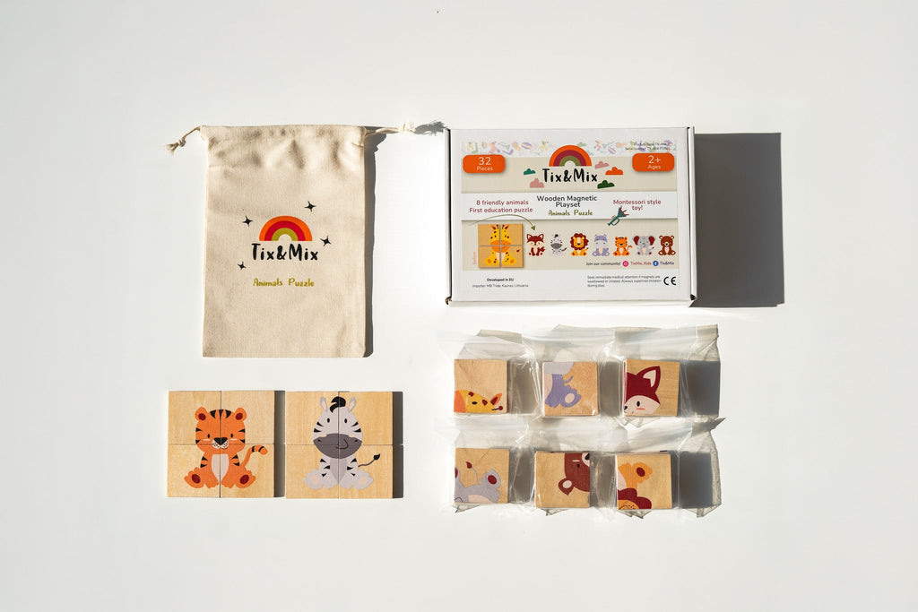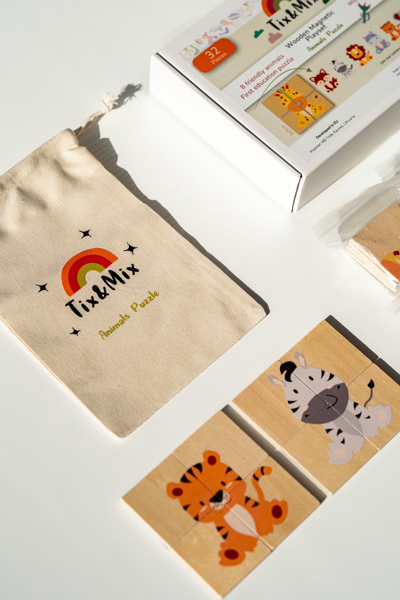 Æfum okkur að púsla með dásamlega dýrapúslinu frá Tix&Mix sem þú getur notað á segulveggnum! Í pakkanum eru 32 seglar eða átta dýr sem að börnin ættu að kannast við og vekja því athygli þeirra. Seglarnir eru úr við, vandaðir og málaðir með eiturefnalausri og umhverfisvænni málningu. Dýrin sem að börnin geta púslað eru ljón, gíraffi, refur, sebrahestur, fíll, björn og flóðhestur!