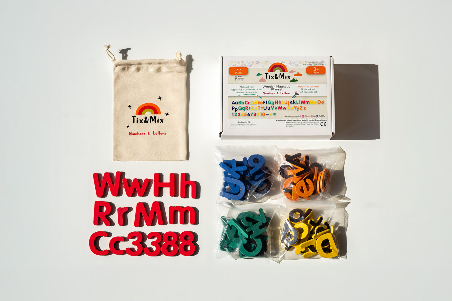Bókstafir og tölustafir frá Tix&Mix sem eru hannaðir fyrir segulvegginn. Í pakkanum eru 77 litríkir seglar hannaðir til þess að ýta undir bókstafa/tölustafa kunnáttu og áhuga barnanna. Seglarnir eru úr við og notuð er eiturefnalaus og umhverfisvæn málning við gerð þeirra.
